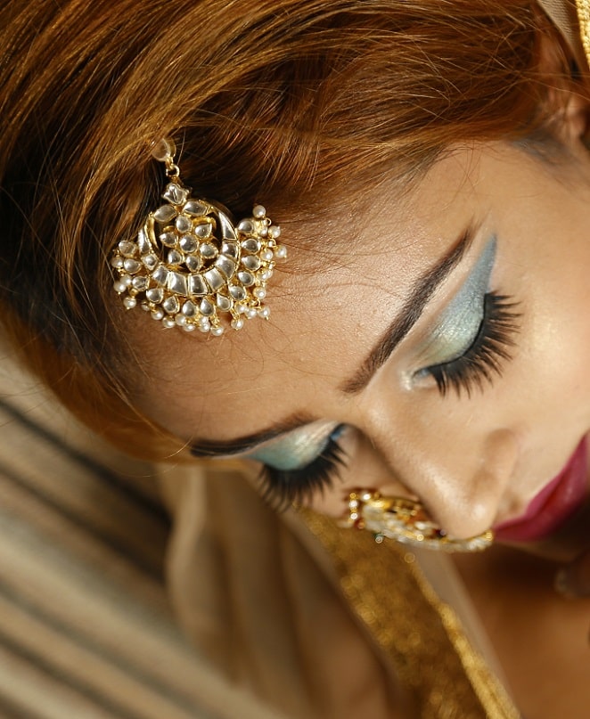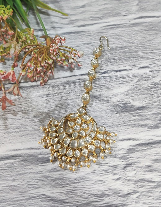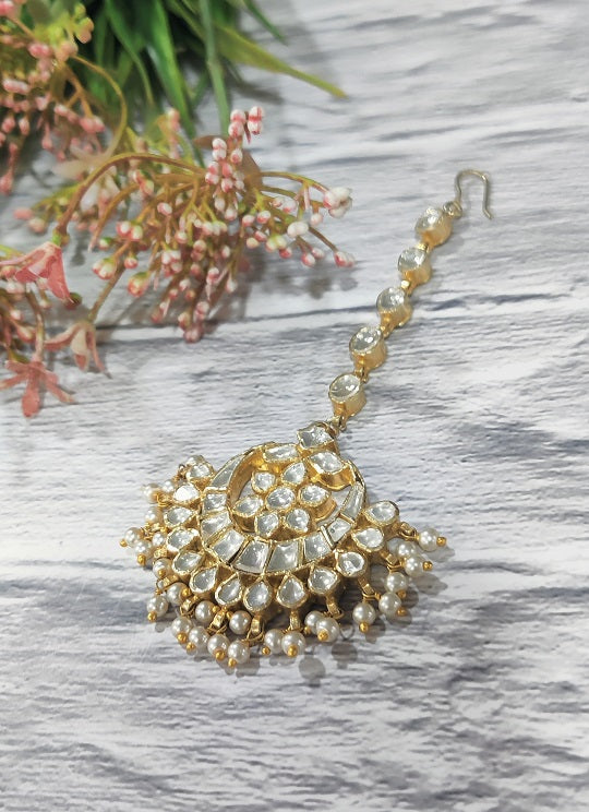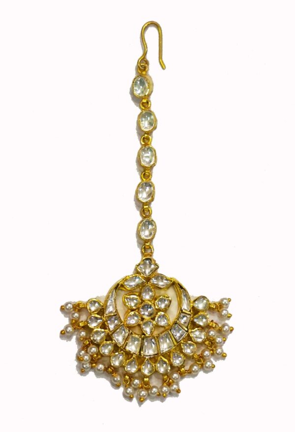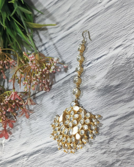 Embellished with the traditional kundan work, set in Silver this maang tikka has unusual blend of shape with Polki. The finishing of white polki makes it bridal.