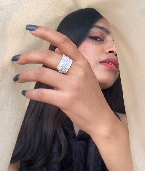 Encrusted with imitation stone this Ring is handcrafted in silver. The simple classic cocktail ring.
