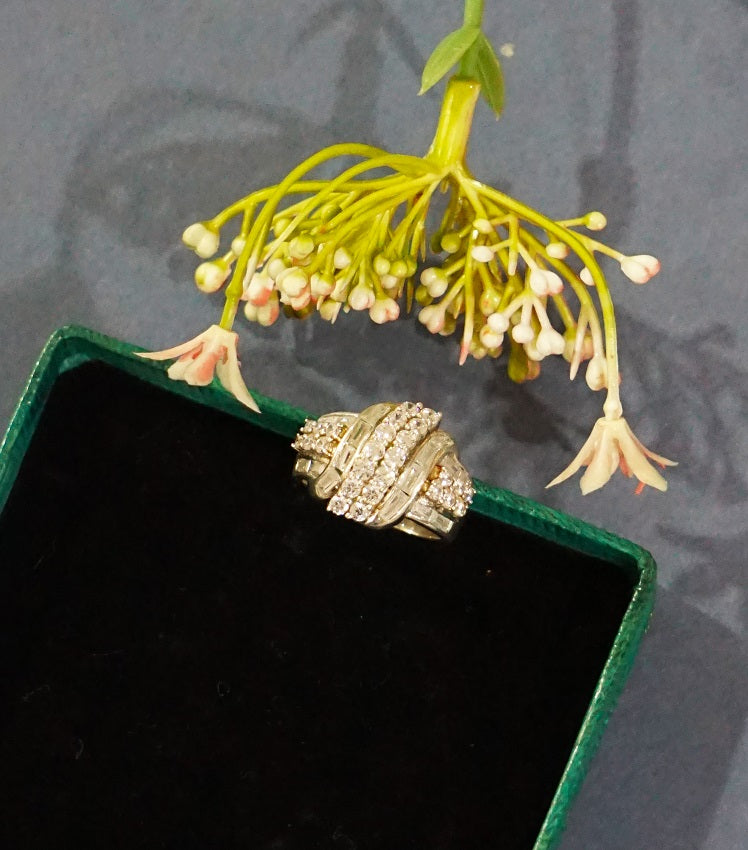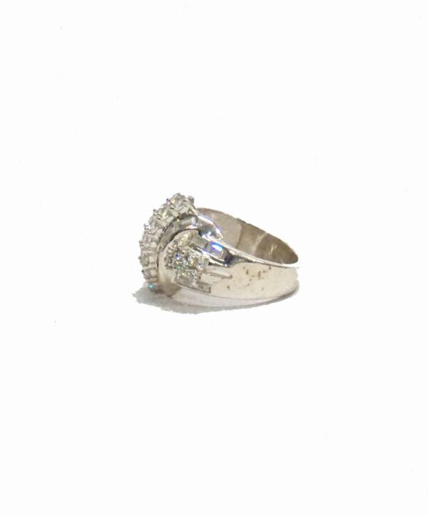 Encrusted with imitation stone this Ring is handcrafted in silver. The simple classic cocktail ring.