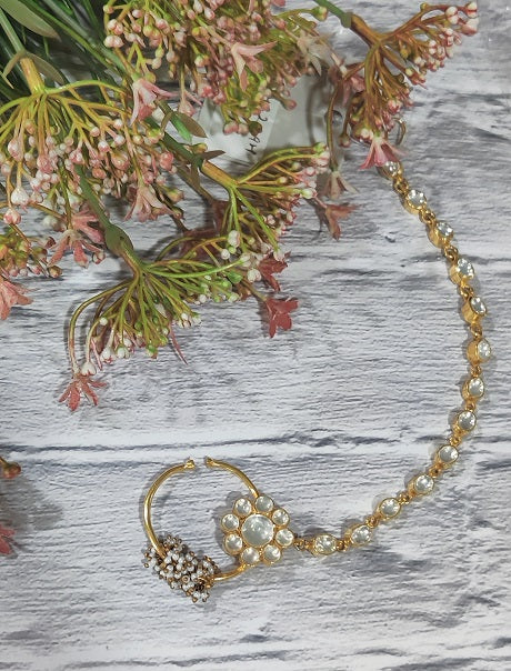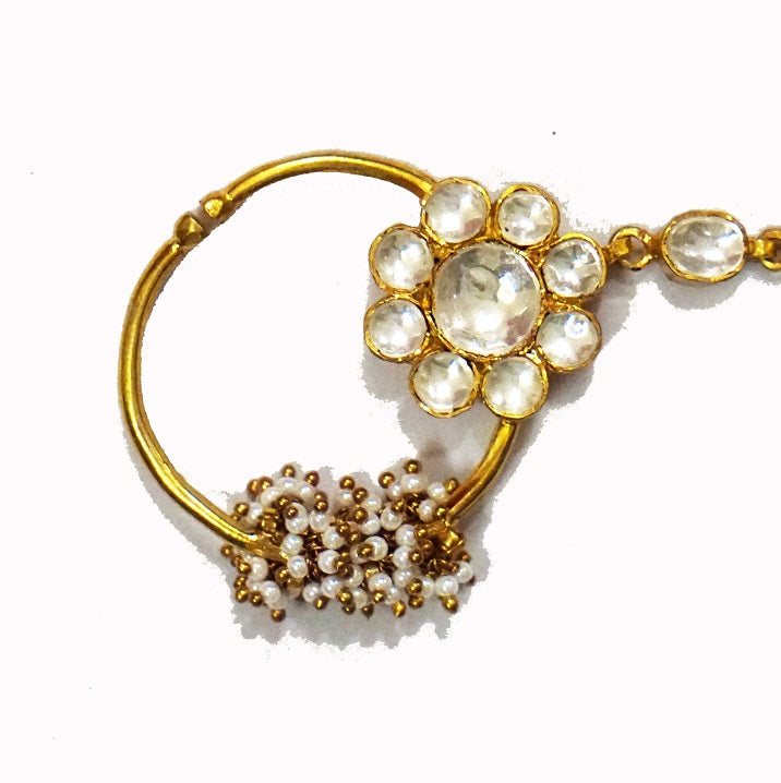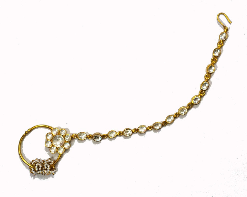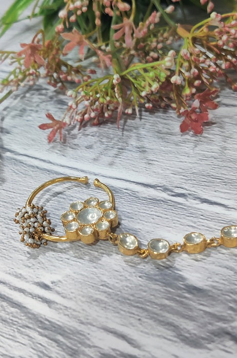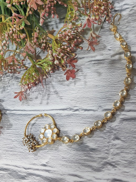 Encrusted with White polki imitation stones, the floral motif stands out. It’s a beautiful Bridal catch.